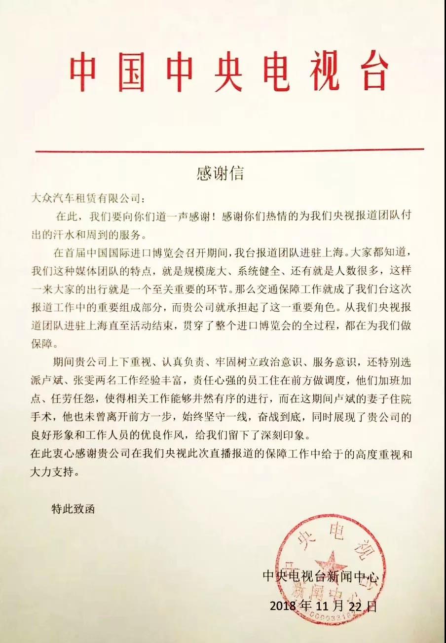尊龙凯时出租租赁继收到上海市政府新闻办表彰信后,近日又收到中央电视台新闻中心、上海机场集团有限公司发来的感谢信,对尊龙凯时在进博会期间提供的优质出行服务表达诚挚的谢意。