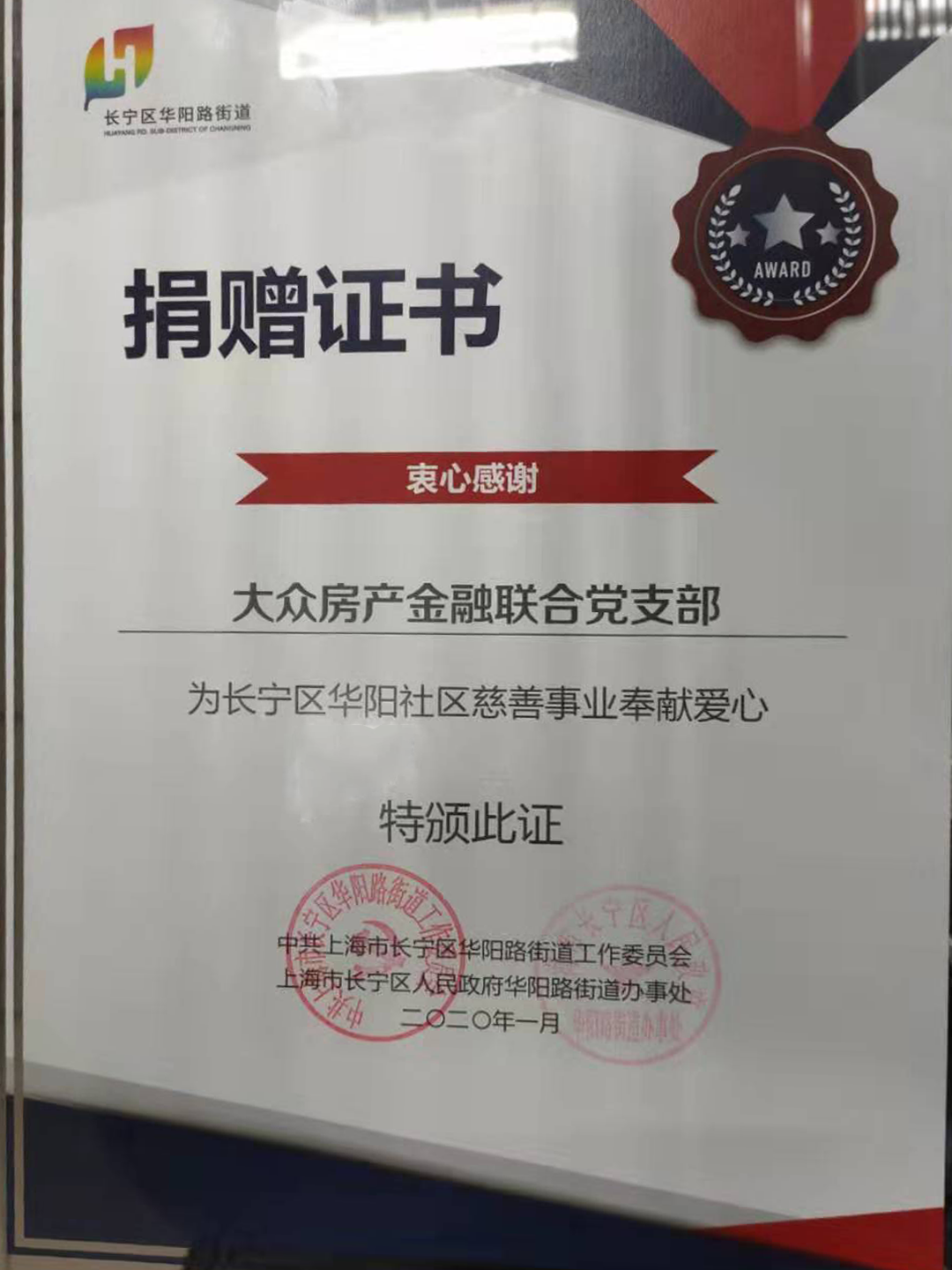 华阳社区向尊龙凯时房产颁发爱心捐赠证书