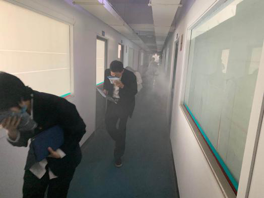 培训最后开展了消防事故逃生演练,通过模拟火灾现场,让与会管理人员现场感受火灾发生时的场景和氛围,并且运用培训中教授的逃生技巧在浓烟弥漫中进行现场撤离,有序逃生。