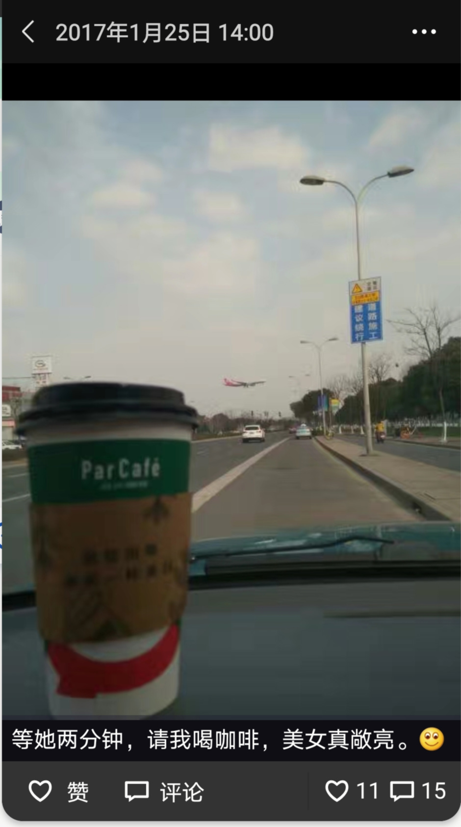 2017年1月,彭师傅在徐家汇拉了一位小姑娘,当时天很冷,车开出一段路后,小姑娘突然问可不可以停车等她一会。彭师傅看附近可以停车就停了下来。不一会小姑娘捧着两杯热咖啡回来,一上车就给了彭师傅一杯说,“师傅,今天外面太冷了,我请您喝杯咖啡暖和暖和。”回忆起这段往事时,彭师傅眼睛依旧闪着光,他说,“我真的非常感动,一路都没舍得喝,一直等小姑娘到达目的地后,我才停下车喝了一口暖暖的咖啡,当时全身都是暖融融的,马上拍照发了一张朋友圈。”