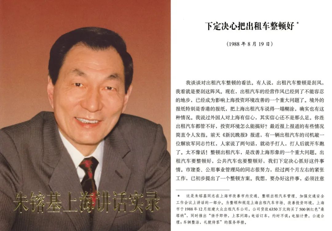 这一年的8月19日,在上海市改善市内交通、整顿出租汽车管理、加强交通安全工作会议上,朱镕基面对全市区县局以上的领导干部,斩钉截铁地表示:“整顿出租汽车,是改善上海形象的一个重大问题……我们下定决心抓好这件事情。”