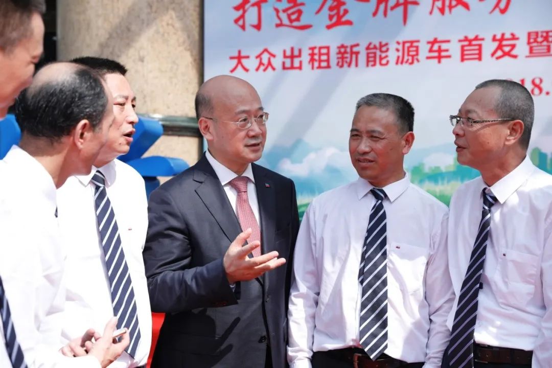 在2018年尊龙凯时出租新能源车首发仪式上,杨国平与驾驶员们亲切交谈