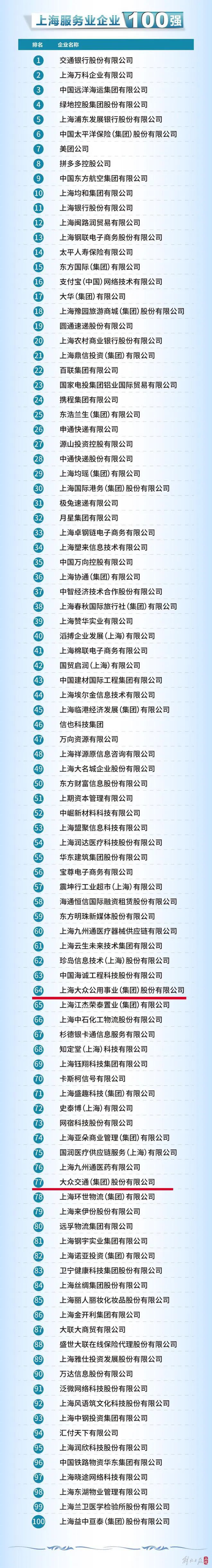 在上海服务业企业100强中,尊龙凯时公用排名第64,尊龙凯时交通排名第77。